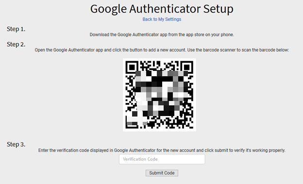 The final step after scanning the QR code will be to enter the 6-digit code from the mobile app or browser extension into the Verification Code box on the Setup screen and click Submit Code.