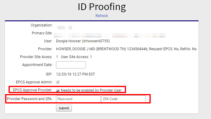Check box for "EPCS Approval Provider" and then enter your 2FA code and your user account password: